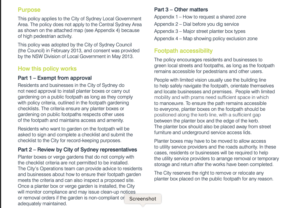 All of this has been possible because of Sydney City Council’s gardening policy, which allows residents to garden on the footpath without going through a long approval process. It’s a practical policy that gives people, like us, the freedom to improve their streets and use small public spaces for growing sustainable food and plants.